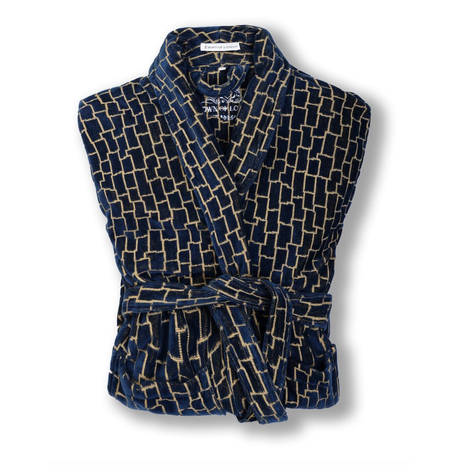 Men’s Heavyweight Dressing Gown – Agean, a luxurious addition to your loungewear collection. This gown features a rich blue and gold colour palette.? Crafted from 100% premium cotton with a 450GSM weight, it offers unmatched warmth and comfort.